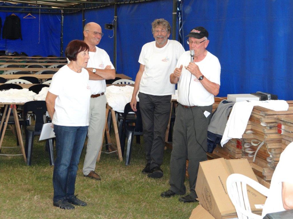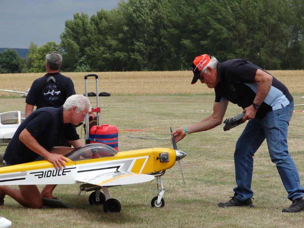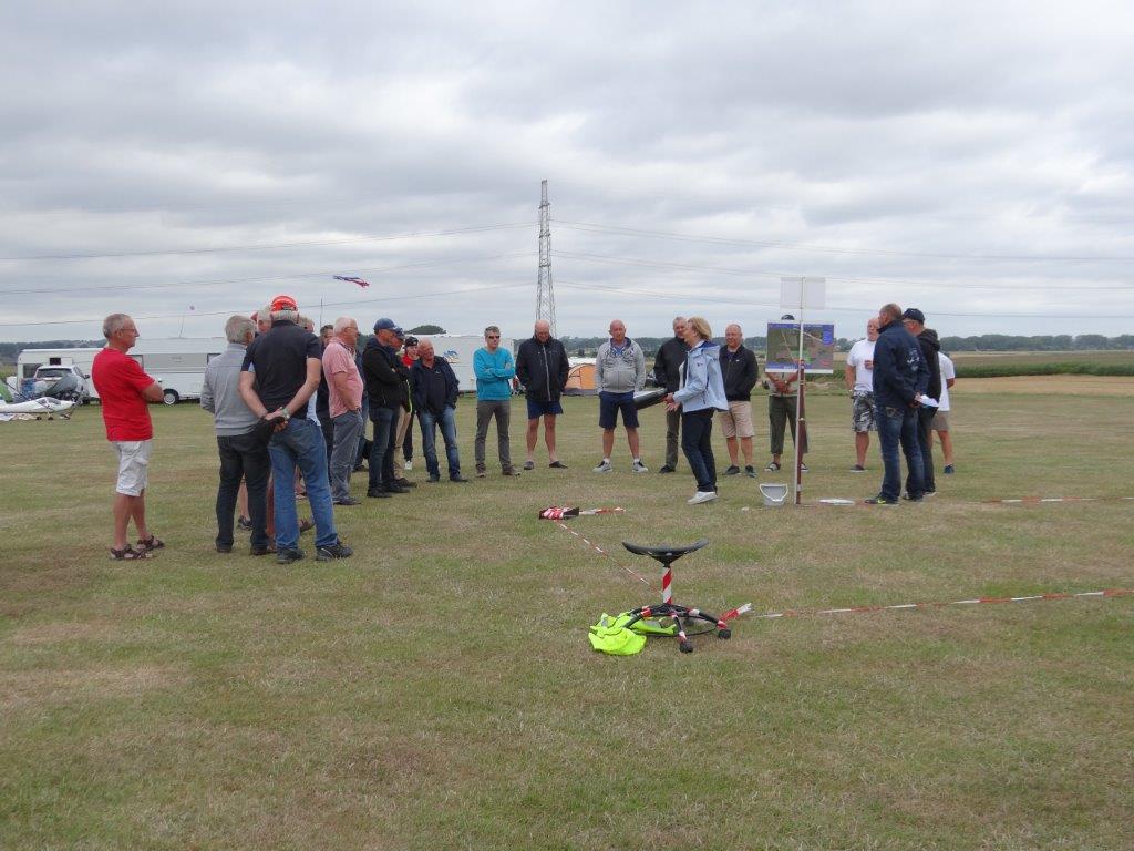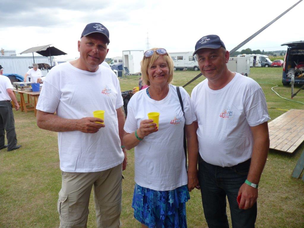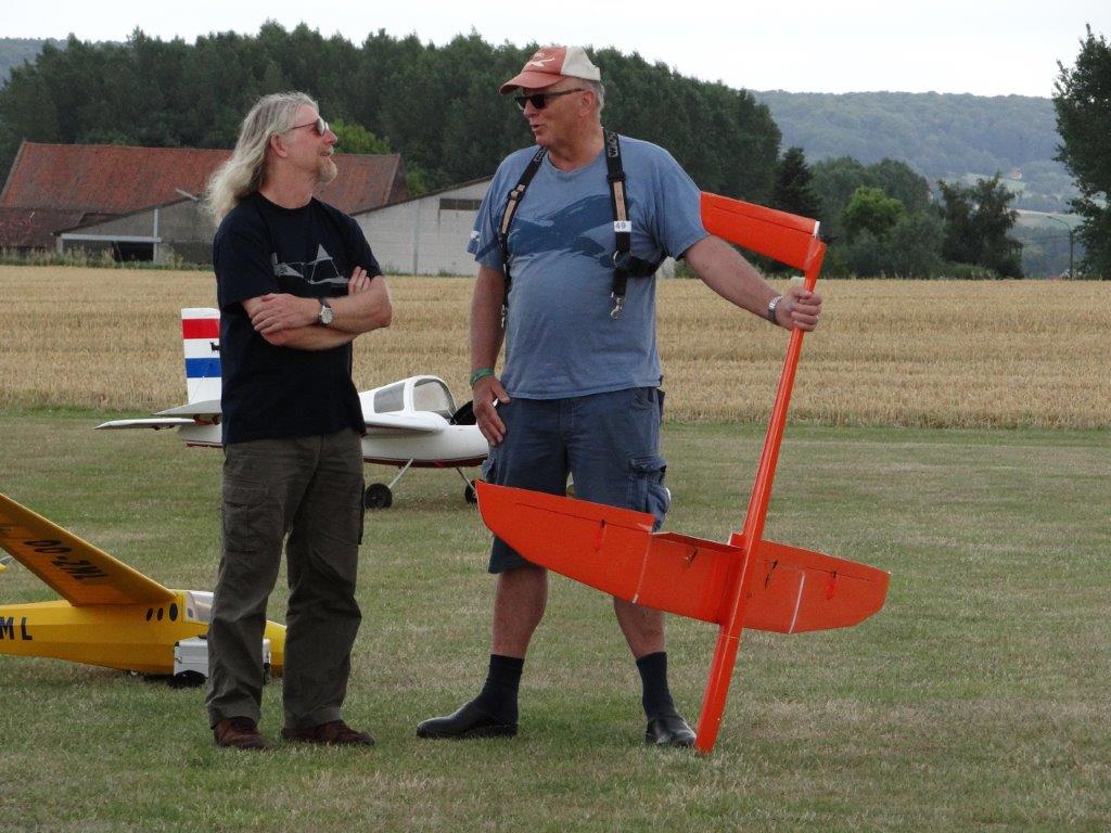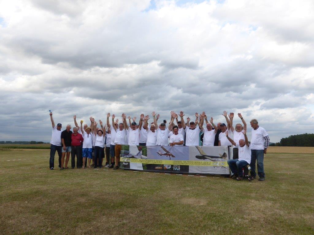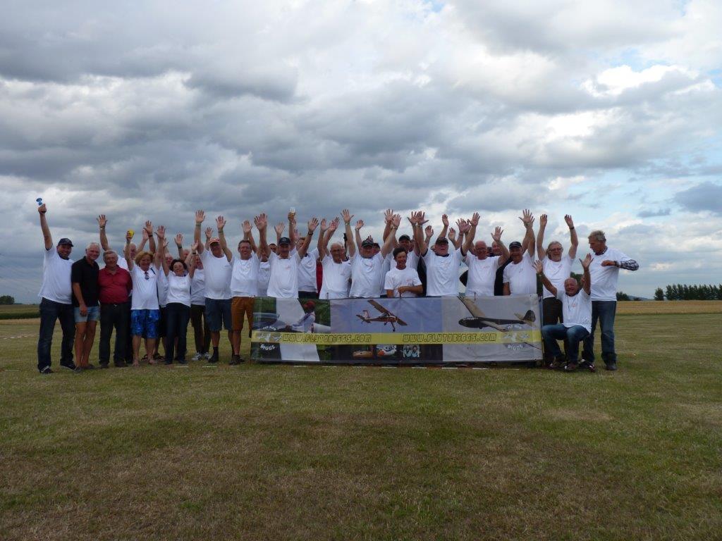 Nog uitzonderlijker was het feit dat ons treffen in Pottes uitverkozen werd om het zweefgedeelte van het 40 jarig AAM jubileum (Waals equivalent van VML/KNVvL) te vieren. Bestuursleden ervan en de voorzitter van de overkoepelende Belgische modelvereninging kwamen zaterdag ter plaatse om het feest op te luisteren. Zij waren fel onder de indruk van de BiGGS aanpak, in het bijzonder onze veiligheidsvoorzieningen en duidelijk beschreven procedures. Na de obligate speeches in de twee belangrijkste landstalen (sorry voor de Duitsers) gaven de AAM vertegenwoordigers aan alle aanwezige piloten een voor het jubileum speciaal ontworpen t-shirt waarmee we met z’n allen op de foto zijn gaan staan bij de BiGGS-Box.
