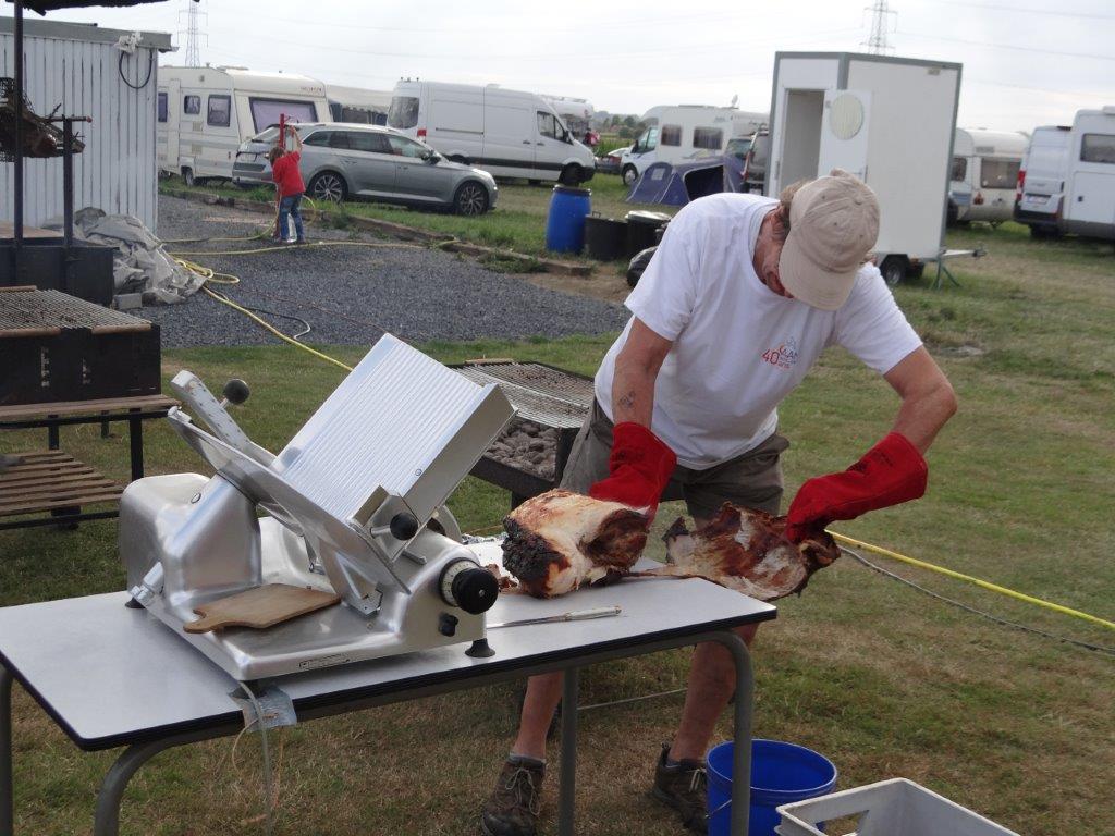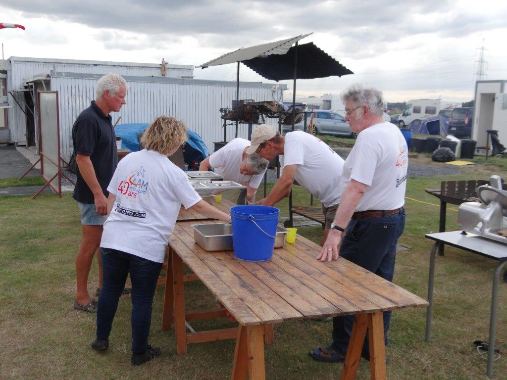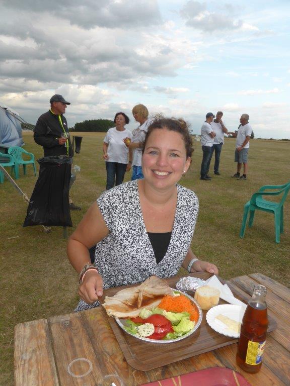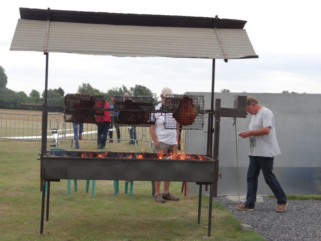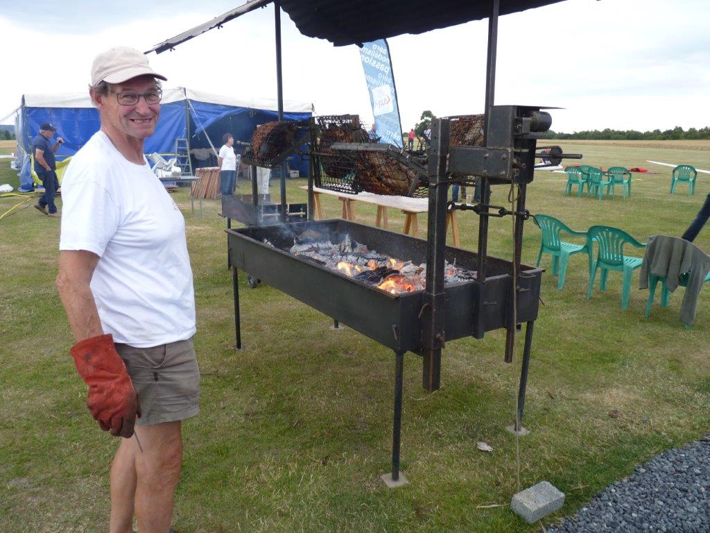 Michelle (dochter van Carel) ontpopte zich tot sociaal leidster en opperde dat de tent niet alleen kon gebruikt worden als stalling voor toestellen, maar nog beter als restaurant waar alle deelnemers met eigen eten op vrijdagavond samen konden komen om gezamenlijk voedsel en dranken te nuttigen. Dit was een uitmuntend initiatief dat leidde tot het beter leren kennen van elkaar, en het was pas lang na middernacht eer de tent afgesloten kon worden. Zaterdag was boer Yves en medewerkers reeds vroeg in de weer om zijn BBQ vuren en hespenbraadtoestel op te stellen. Tegen de middag konden we worsten met brood eten maar dat laatste viel bij sommigen zo niet in de smaak, het bewijs dat 20km ver rijden om een goede bakker te vinden zo nog geen slecht idee was. Tegen de avond kwamen dan de verrukkelijke hespen aan de beurt, rijkelijk gegarneerd met groenten, aardappel in de schil en kaas als dessert. Door het barslechte weer van zondagmorgen was het wat wachten op de BBQ van de middag, maar gezien er door de felle wind toch niet gevlogen werd was dit geen probleem. Aperitieven gedurende het weekend vloeiden ook rijkelijk, de befaamde Eole punch/sangria werd dit jaar aangevuld door diverse streekdranken meegebracht door Michel uit het zuidwest Frankrijk, meestal met Armaniac als ingrediënt.