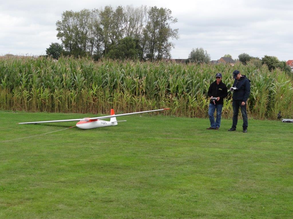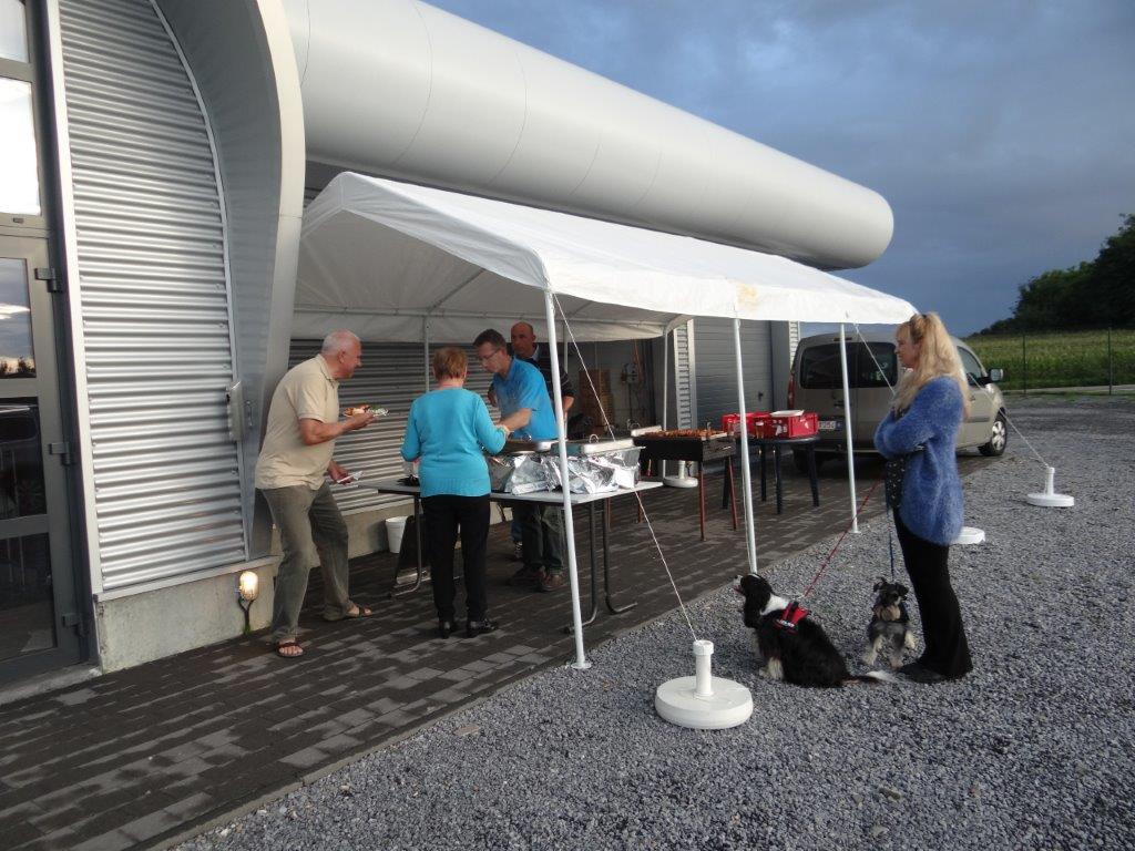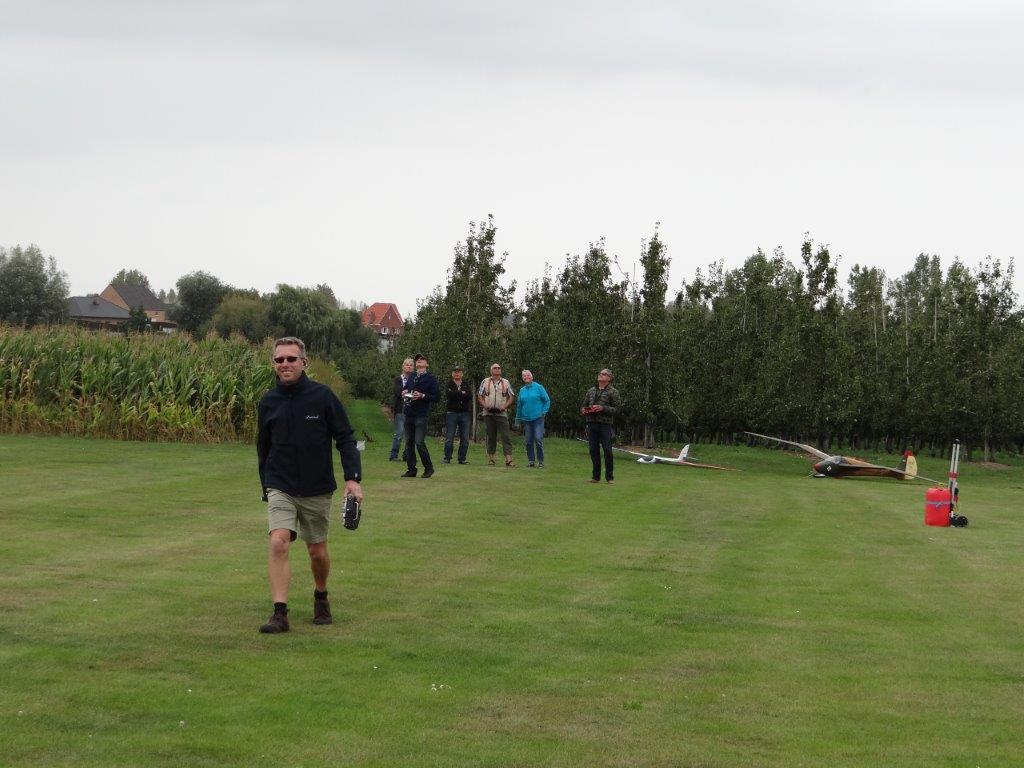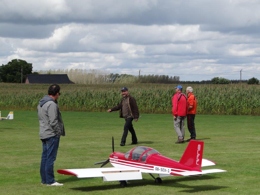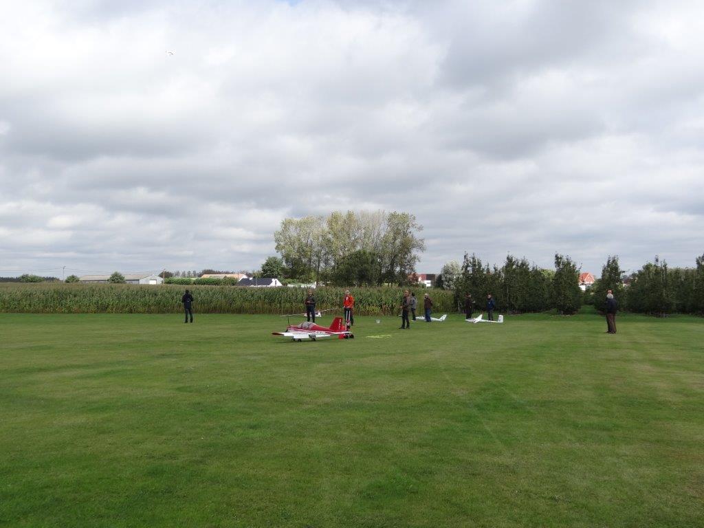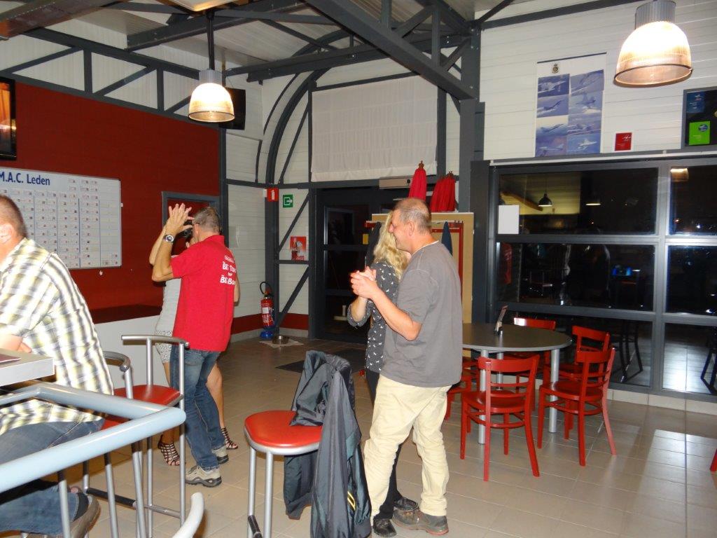 Zaterdag werd er tussen de buien door wat gevlogen. Plastic zeil werd meermaals heen- en weer over de toestellen getrokken. Opnieuw een stevige bries, maar gelukkig altijd in de lengte van de piste. De vloot werd die dag nog aangevuld door een joekel van een K6, en nog een Bidule111, gevlogen door Daniël. Traditioneel werd zaterdag afgesloten door een geweldige barbecue. Alles was tot in de puntjes voorbereid. Kandidaten die zich op voorhand hadden ingeschreven kregen een envelop met daarin de “bonnekes” voor 3 stukken vlees en een drankje. Waarom de bonnetjes kleiner dan een postzegel waren, weet ik nog altijd niet. Maar die 5 Michelin-sterren golden evengoed voor de overheerlijke BBQ. Top! Een dankwoordje van onze voorzitter, warm applaus voor alle medewerkers van de gastclub, en een slotwoord van de lokale voorzitter zette de avond in.