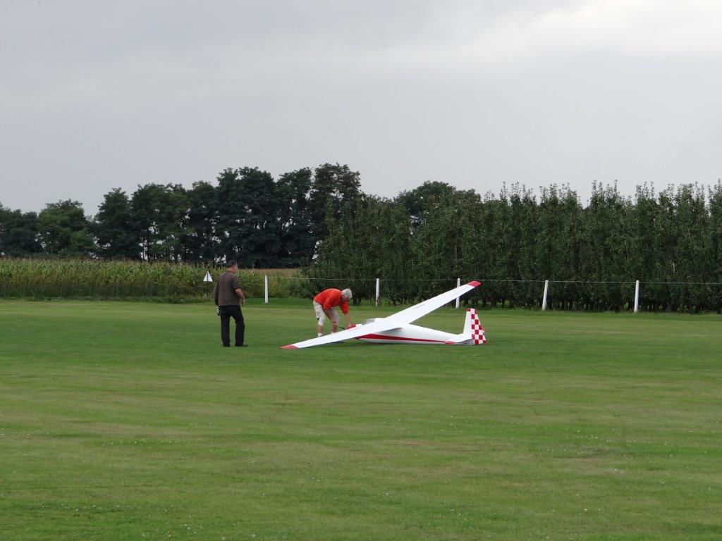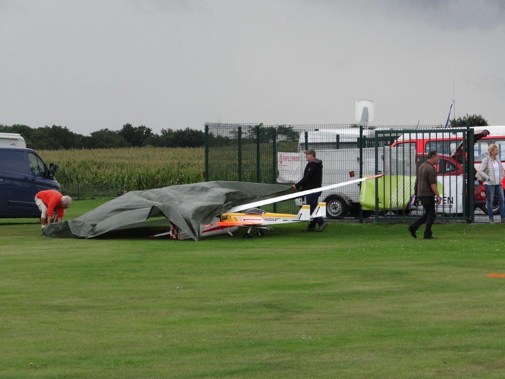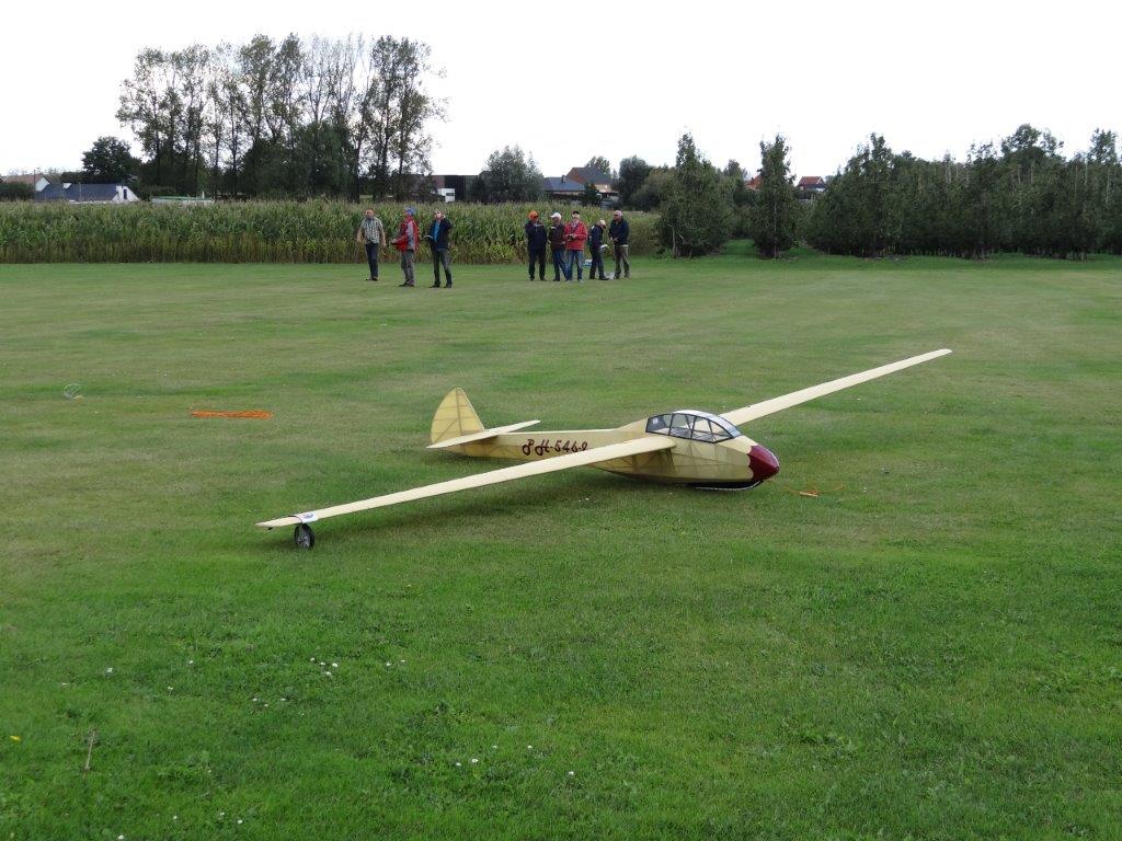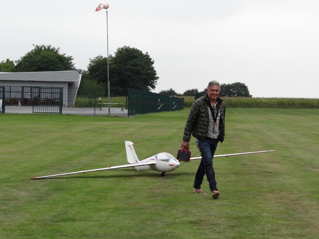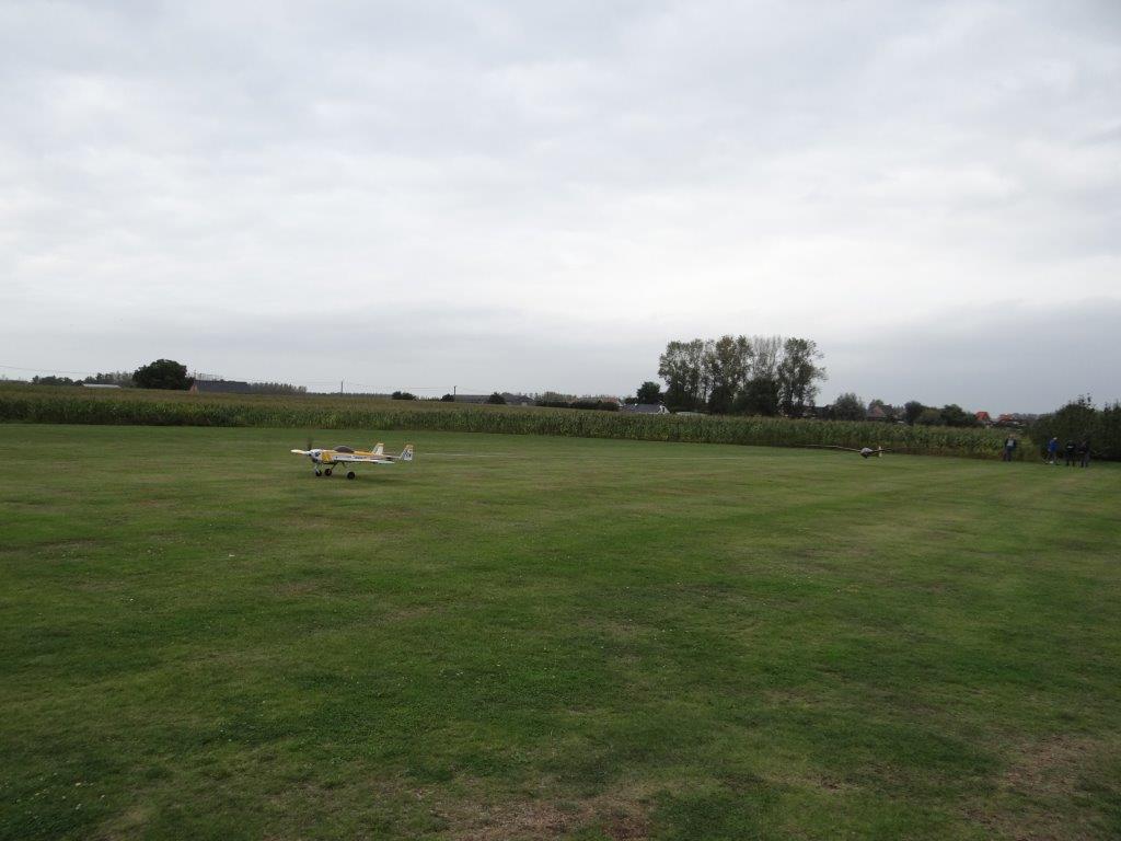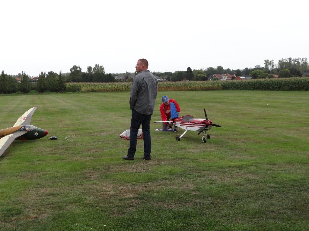 Zaterdag werd er tussen de buien door wat gevlogen. Plastic zeil werd meermaals heen- en weer over de toestellen getrokken. Opnieuw een stevige bries, maar gelukkig altijd in de lengte van de piste. De vloot werd die dag nog aangevuld door een joekel van een K6, en nog een Bidule111, gevlogen door Daniël. Traditioneel werd zaterdag afgesloten door een geweldige barbecue. Alles was tot in de puntjes voorbereid. Kandidaten die zich op voorhand hadden ingeschreven kregen een envelop met daarin de “bonnekes” voor 3 stukken vlees en een drankje. Waarom de bonnetjes kleiner dan een postzegel waren, weet ik nog altijd niet. Maar die 5 Michelin-sterren golden evengoed voor de overheerlijke BBQ. Top! Een dankwoordje van onze voorzitter, warm applaus voor alle medewerkers van de gastclub, en een slotwoord van de lokale voorzitter zette de avond in.