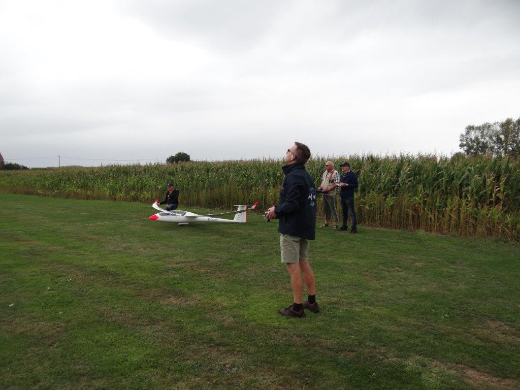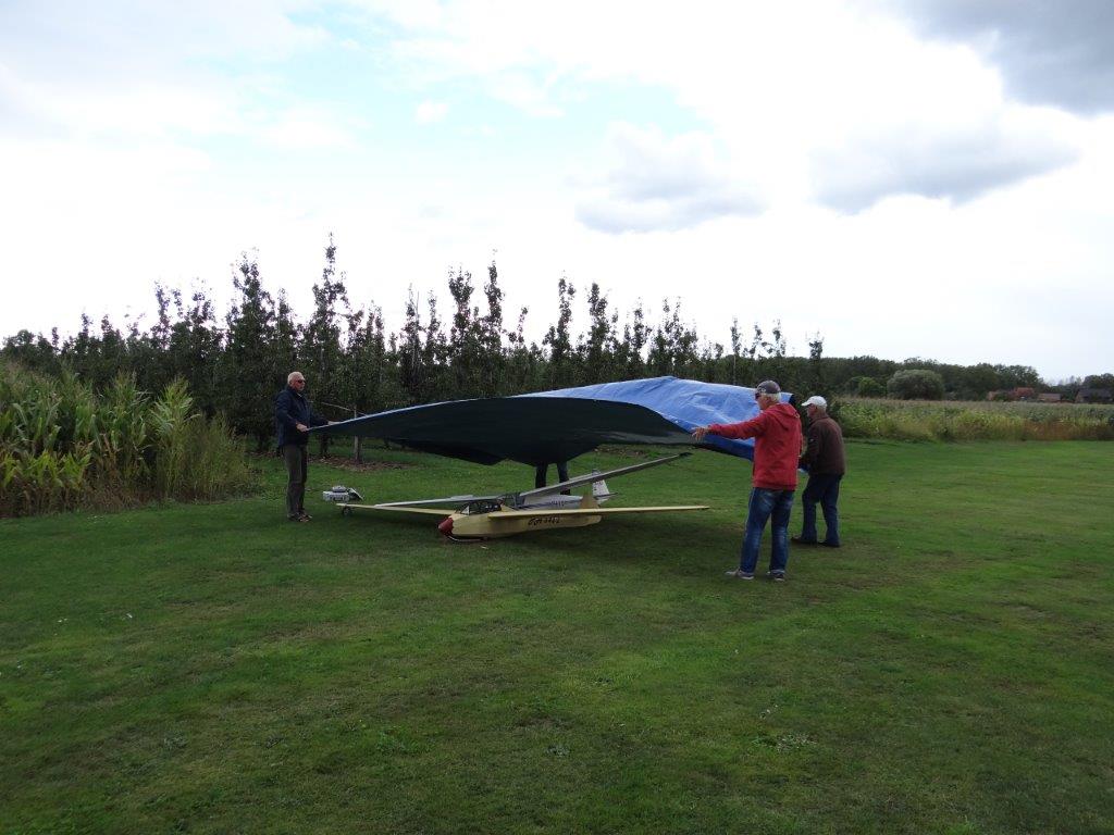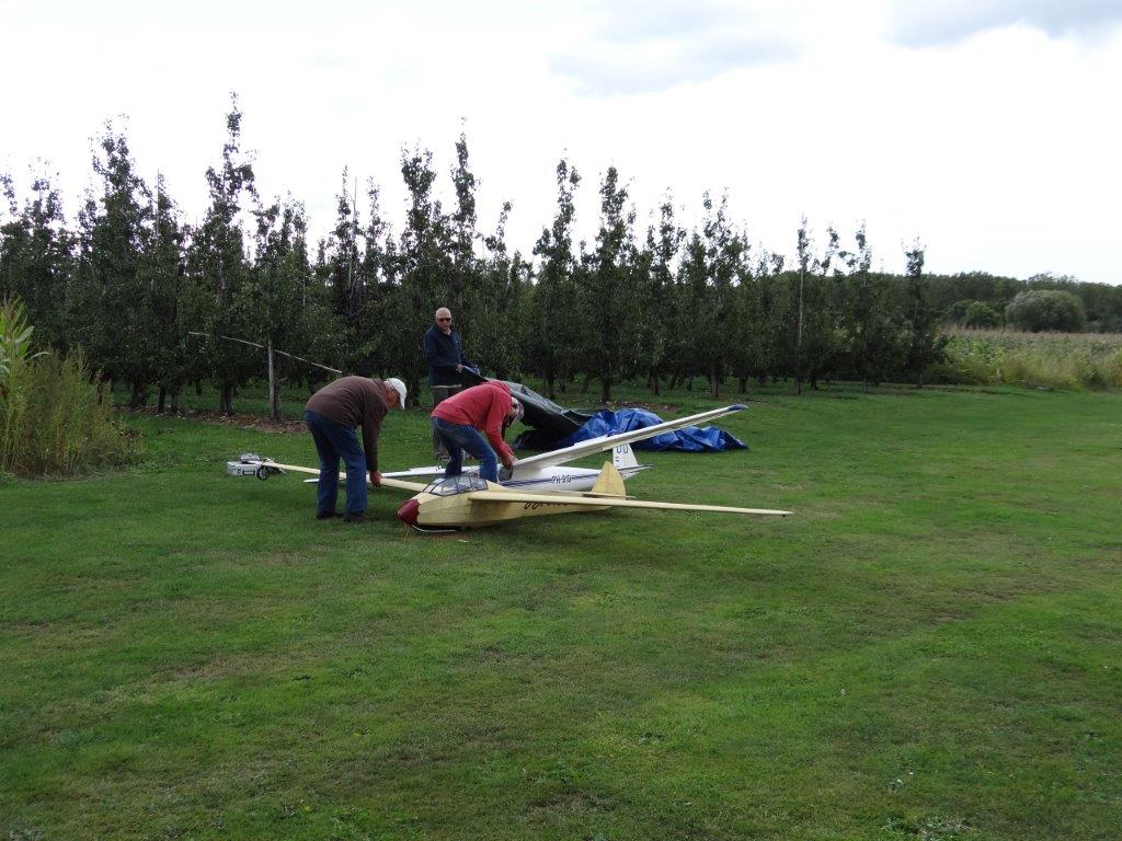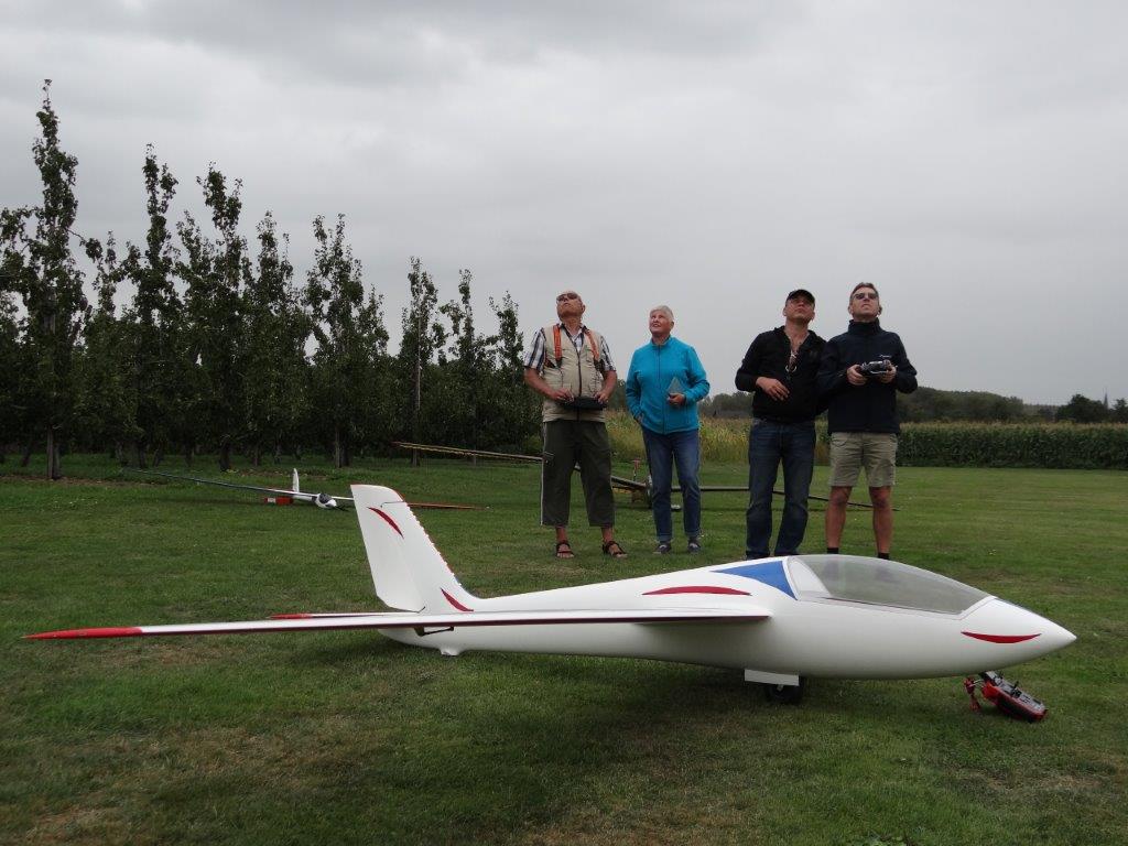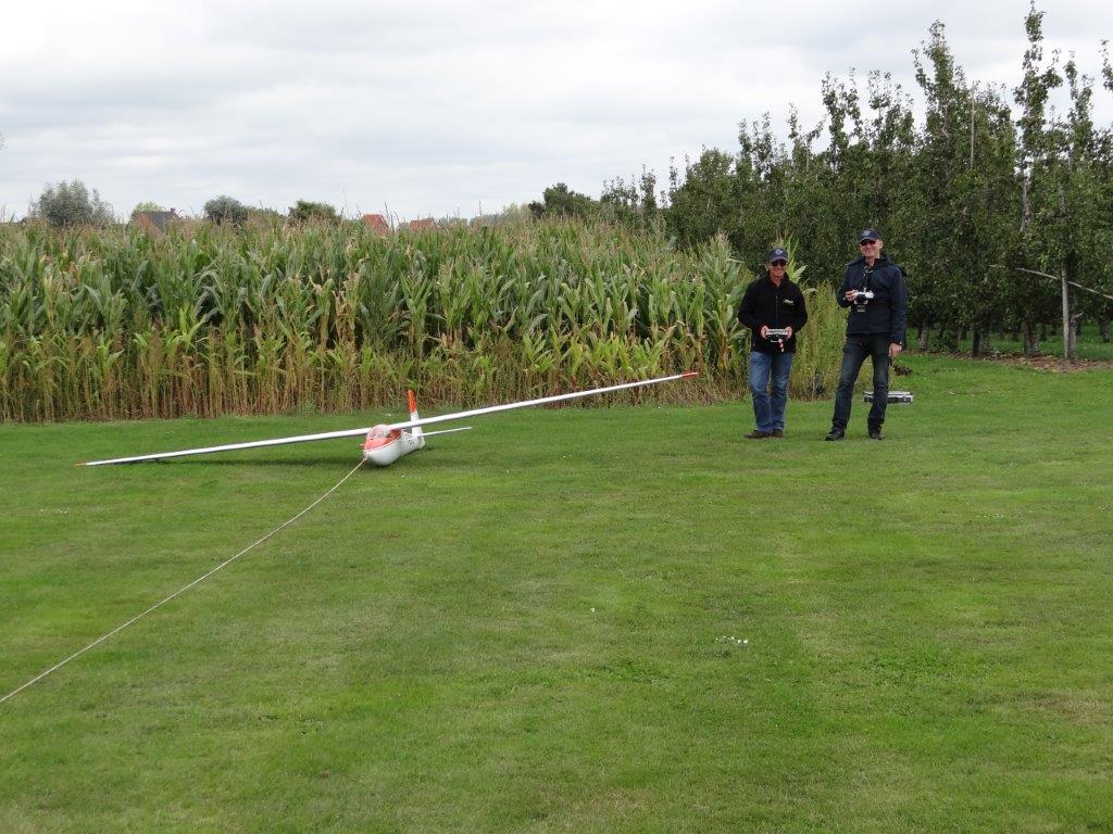 Zondagmorgen startte met de aangekondigde vergadering om 09u30. Het verslag van die vergadering krijgt een eigen plaats op de site. Na de vergadering werd deze laatste vliegdag ten volle benut. Hier en daar kwam je kleine thermiekbellen tegen. Uitgerekte wolkenformaties en een matige wind in de lengte van de piste: prima weertje om opnieuw een kandidaat sleeppiloot, met name Daniël, bij te staan (dankjewel Eric) en te helpen om de uitgebreide keuze aan verschillende zweeftoestellen ophoog te trekken.
